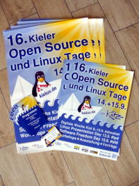 Ab sofort könnt Ihr das Plakat für die 16. Kieler Open Source und Linux Tage sowohl herunterladen als auch gedruckt im Kitz in den Größen DIN A3 und A2 (während der Öffnungszeiten) abholen. Außerdem liegen die Programmflyer und Visitenkarten mit dem Veranstaltungsdatum für Euch bereit.