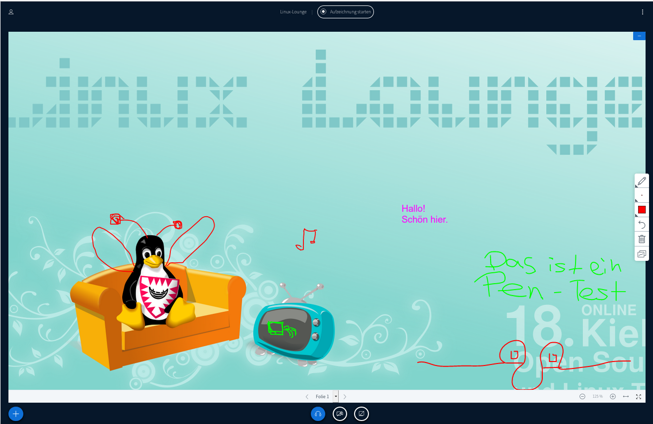 Im weiteren Verlauf der Veranstaltung lief die Technik größtenteils rund. Dank der sehr guten Internetanbindung des Kitz, der fachkundigen Unterstützung durch Jean von LinuxGuides, des gut aufgestellten BigBlueButton-Servers unseres Infrastrukturpartners ennit, der mit Hilfe unserer Sponsoren neu angeschafften Technik (Mikrofone, Kameras, Konverter, Kabel, …) und guter Vorbereitung konnten unsere Zuschauer ohne größere Probleme an den Vorträgen und Workshops teilnehmen.
