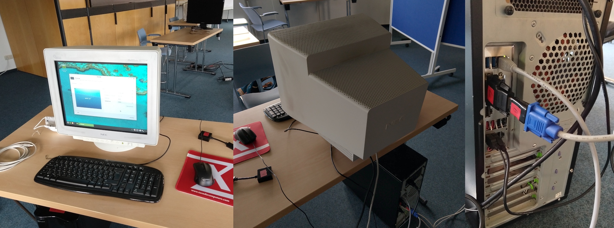 Bei einer Vor-Ort-Generalprobe eine Woche vor Veranstaltungsbeginn haben wir das Aufstellen der Technik, die richtige Verkabelung und Beleuchtung geübt und letzte Netzwerkprobleme im Kitz gefunden und behoben. Einige unserer schicken Flachbildschirme mussten wir leider entsorgen, und so kam für die Tests erprobte Röhrentechnik vom Anfang des Jahrtausends zum Einsatz.