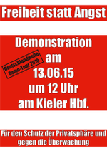 Am 13.06 macht die "Freiheit statt Angst"-Tour 2015 halt in Kiel. Seid mit dabei und demonstriert für Datenschutz und gegen staatliche (NSA-)Überwachung und Vorratsdatenspeicherung.